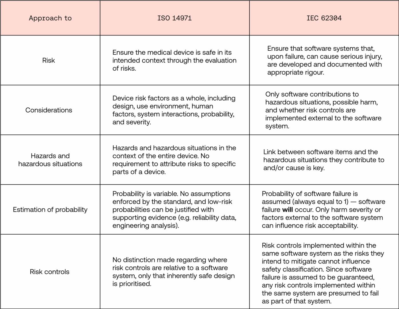 Manufacturers often struggle with IEC 62304 and software classification due to a common misconception: that risks are considered similarly to their definitions in ISO 14971. These standards differ in their approach to risk and fundamental intent, which, if poorly understood, can result in SaMD manufacturers making critical decisions that lead to inconsistencies in documentation and delays in device certification.